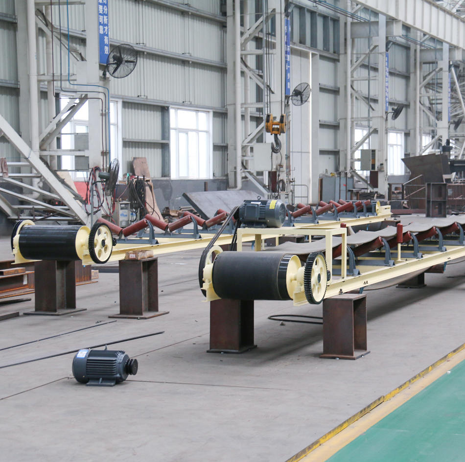 皮帶輸送機主要由兩個端點滾筒及緊套其上的閉合輸送帶組成。帶動輸送帶轉(zhuǎn)動的滾筒稱為驅(qū)動滾筒(傳動滾筒),另一個僅在于改變輸送帶運動方向的滾筒稱為改向滾筒。驅(qū)動滾筒由電動機通過減速器驅(qū)動,輸送帶依靠驅(qū)動滾筒與輸送帶之間的摩擦力拖動。驅(qū)動滾筒一般都裝在卸料端,以增大牽引力,有利于拖動。物料由喂料端喂入,落在轉(zhuǎn)動的輸送帶上,依靠輸送帶摩擦帶動運送到卸料端卸出。